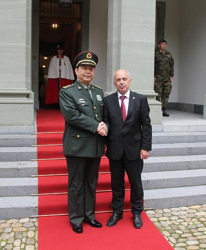 9月3日,在瑞士首都伯尔尼,中国国务委员兼国防部长常万全(左)与瑞士联邦委员兼国防、民防和体育部长于利·毛雷尔握手。正在瑞士访问的中国国务委员兼国防部长常万全与瑞士联邦委员兼国防、民防和体育部长于利·毛雷尔3日下午举行会谈,双方就两国两军关系及国际和地区安全问题交换了意见。新华社记者 张淼 摄