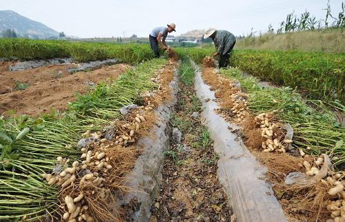 9月8日,山东省枣庄市山亭区张庄村农民在收获花生。新华社发(李宗宪 摄)