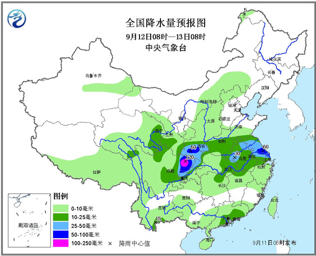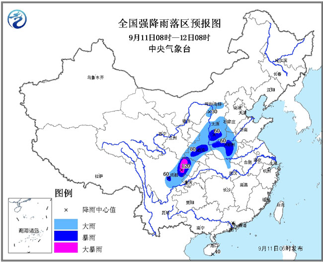 11-13日,西北地区东部、四川北部和东部、重庆西部和北部、内蒙古河套东部、山西、黄淮西部和南部、湖北北部、江淮东部、江南东北部等地有中到大雨,其中,陕西中南部、山西南部、四川盆地大部、河南中部、江苏南部等地的部分地区有暴雨,四川盆地中北部局地有大暴雨(100~120毫米),上述部分地区并伴有短时雷雨大风等强对流天气。另外,13日,内蒙古东北部和黑龙江西北部的部分地区有大雨。中央气象台9月11日06时继续发布暴雨蓝色预警。 未来三天,受冷空气影响,新疆北部、西北地区东部、华北大部地区气温下降4~8℃,局地气温降幅可达10℃以上,并伴有4~6级偏北风,新疆山口地区风力可达7~9级。