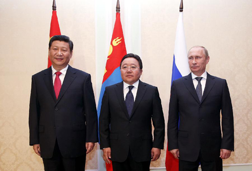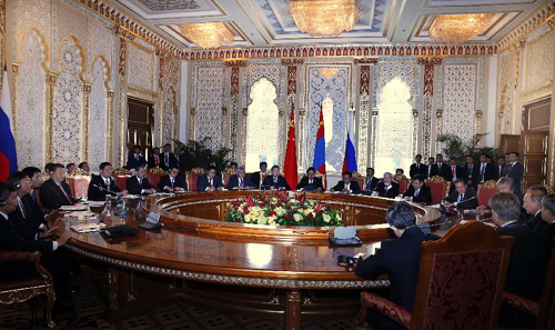 9月11日,中国国家主席习近平在塔吉克斯坦首都杜尚别同俄罗斯总统普京、蒙古国总统额勒贝格道尔吉举行中俄蒙元首会晤。 新华社记者 鞠鹏摄
