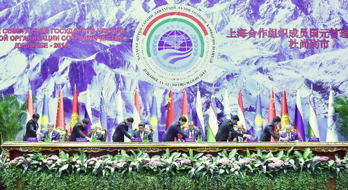 9月12日,上海合作组织成员国元首理事会第十四次会议在塔吉克斯坦首都杜尚别举行。国家主席习近平出席会议并发表重要讲话。这是习近平等成员国元首共同出席签字仪式。新华社记者李涛摄