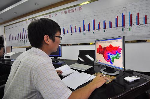 9月14日,汉江集团信息中心水调科工作人员在密切关注汉江上游来水情况。 新华社发(陈华平 摄)