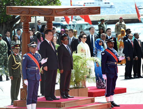 9月15日,国家主席习近平同马尔代夫总统亚明在马累举行会谈。会谈前,亚明在共和国广场为习近平举行欢迎仪式。 新华社记者 鞠鹏 摄