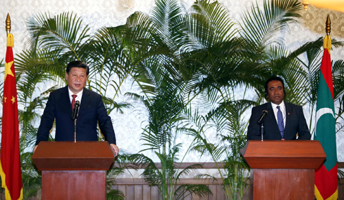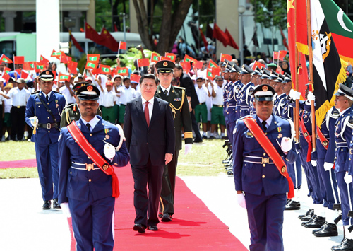 9月15日,国家主席习近平同马尔代夫总统亚明在马累举行会谈。会谈前,亚明在共和国广场为习近平举行欢迎仪式。 新华社记者 马占成 摄 新华社马累9月15日电(记者陈贽 李斌 刘华)9月15日,国家主席习近平同马尔代夫总统亚明在马累举行会谈。两国元首在亲切友好的气氛中就双边关系和共同关心的问题交换意见,一致同意建立中马面向未来的全面友好合作伙伴关系。 会谈前,亚明在共和国广场为习近平举行欢迎仪式。海风送爽,晴空万里。当地时间上午10时许,习近平和夫人彭丽媛乘船抵达总统府所在的马累岛1号码头,受到亚明总统夫妇热情迎接。在码头出口广场,马尔代夫青年载歌载舞,欢迎中国贵宾。两国元首一同登上检阅台,鸣礼炮21响,奏中马两国国歌。习近平检阅仪仗队。两国元首相互介绍陪同人员。欢迎仪式结束后,身着传统服装的仪仗方队队员高擎华盖,手持两国国旗和长矛,在鼓乐伴奏下,护卫习近平前往总统府。当地儿童挥舞中马两国国旗、手举中马友好标语站在道路两侧,习近平向他们挥手致意。 欢迎仪式后,两国元首举行会谈。亚明再次对习近平表示热烈欢迎。亚明表示,一个月前,我赴华出席南京青奥会开幕式,同习近平主席举行了很好的会谈。我邀请习近平主席早日访问马尔代夫,你接受了我的邀请,很快成行,马尔代夫人民深感荣幸。相信这次访问必将把马中关系提升到新的高度。 习近平指出,中马两国元首在短短一个月内实现互访,体现了我们两国关系亲密友好。我们在南京谈得很好,这次我希望同你就两国合作特别是共建21世纪海上丝绸之路进一步交换意见,推动取得积极进展。 习近平指出,中马两国关系很好,不存在任何困难和障碍,有的只是深化友谊,加强合作的共同意愿。中方尊重马尔代夫独立、主权、领土完整,尊重马尔代夫人民根据自身国情选择政治制度和发展道路。新形势下,中方愿意同马方一道,深化传统友好,构建中马面向未来的全面友好合作伙伴关系。 习近平强调,双方要继续保持高层互访,扩大各领域交流合作。中方愿意同马方加强海洋经济、海上安全、海洋科研和环保、灾害防控等领域合作,通过经贸合作联委会机制,规划好双边贸易投资,重点推进基础设施建设和民生领域合作。中方将积极研究支持马方提出的马累-机场岛跨海大桥项目,支持中国企业参与马方经济发展计划和青年城等项目建设,投资马尔代夫旅游服务业,鼓励更多中国公民来马旅游。希望马方采取有效措施,切实保障中国游客安全和合法权益。中方理解马尔代夫等小岛屿国家在应对气候变化、实现可持续发展方面的关切,将在南南合作框架内向马方提供物资援助,在人力资源培训、节能环保技术等方面开展合作,并同马方加强在气候变化问题国际谈判中的协调和配合,推动有关会议按照共同但有区别的责任原则取得全面、均衡的结果,共同维护发展中国家权益。 亚明表示,中国是大国,马尔代夫是发展中的小岛国,两国国情有天壤之别,但我们都追求和平与繁荣。马方感谢中方积极支持和帮助马尔代夫经济发展。马方视中方为最真诚、最可靠的朋友,马中关系堪称大小国家平等相待、相互尊重、友好相处、互利合作的典范。习近平主席提出建设21世纪海上丝绸之路的倡议富有远见,马方完全支持并愿抓住机遇,积极参与。马累-机场岛跨海大桥和青年城项目对马经济社会发展意义重大,马方感谢中方提供的合作。我提议将大桥命名为“中马友谊大桥”。马方希望同中方扩大旅游、人文领域交流合作,愿意积极采取措施保障中国游客安全和权益。马方赞赏中方在国际事务中奉行和平共处五项原则,愿意同中方加强在气候变化等多边事务上的协作。