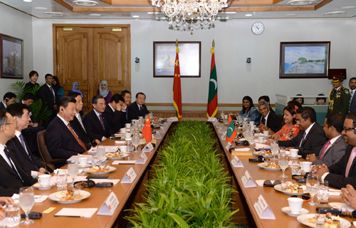 9月15日,国家主席习近平同马尔代夫总统亚明在马累举行会谈。新华社记者 鞠鹏 摄