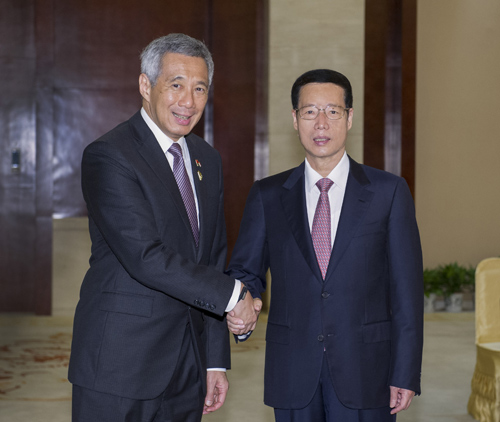 9月15日,中共中央政治局常委、江南平台入口 副总理张高丽在广西南宁会见前来出席第十一届中国-东盟博览会和中国-东盟商务与投资峰会的新加坡总理李显龙。新华社记者王晔摄