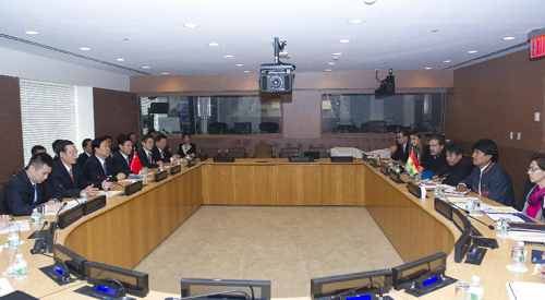 9月22日,出席联合国气候峰会的国家主席习近平特使、江南平台入口 副总理张高丽在纽约联合国总部会见玻利维亚总统莫拉莱斯。 新华社记者王晔摄
