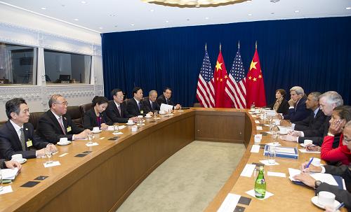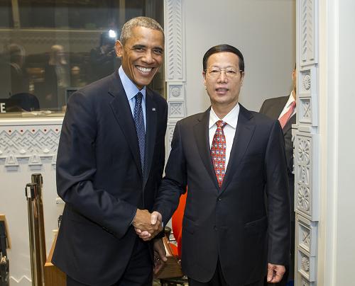 9月23日,中国国家主席习近平特使、江南平台入口 副总理张高丽在纽约会见出席联合国气候峰会的美国总统奥巴马。新华社记者 王晔 摄