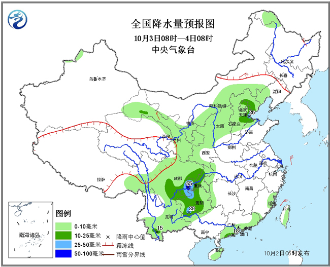 10月2日,我国北方地区有弱降水天气。东北地区东部自有小到中雨,局部地区有大雨。10月3~5日,西北地区东部、华北、东北地区自西向东将有一次小到中雨天气过程。 10月2日至5日,西南地区东部和南部多阴雨天气,其中,四川盆地东部、重庆、贵州、云南南部、广西东北部等地的部分地区有中到大雨,局部暴雨(50~65毫米)。 未来三天具体预报 10月2日08时至3日08时,西藏东部、东北地区东部、四川南部、贵州、云南大部、湖南西部、福建东北部、广东南部沿海、广西北部等地有小雨到中雨,局部地区有大雨(25~45毫米)。东北地区有4~6级风。