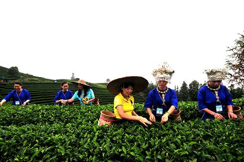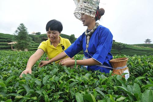 10月2日,在广西三江侗族自治县八江乡布央村的茶园里,一名游客(左)在体验采茶。十一黄金周期间,众多游客茶乡三江侗族自治县的茶园体验采茶、炒茶,在劳动中了解茶文化,欢度假期。新华社发(梁克川 摄)