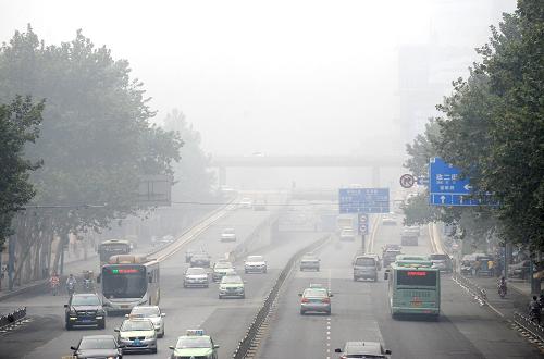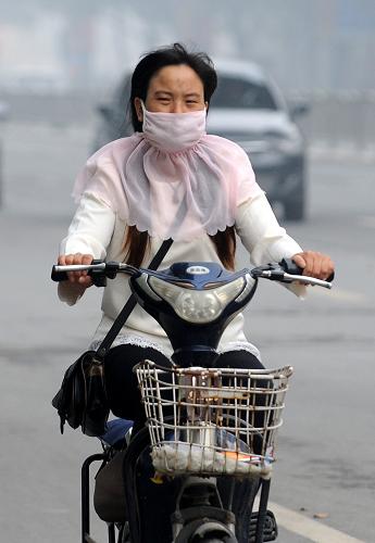 10月5日,郑州市区被雾霾笼罩。当日,河南省郑州市区被雾霾笼罩,空气质量状况为重度污染,很多市民出门时选择用口罩、围巾等物品护住口鼻,防止吸入空气中的污染物。新华社记者 李安 摄