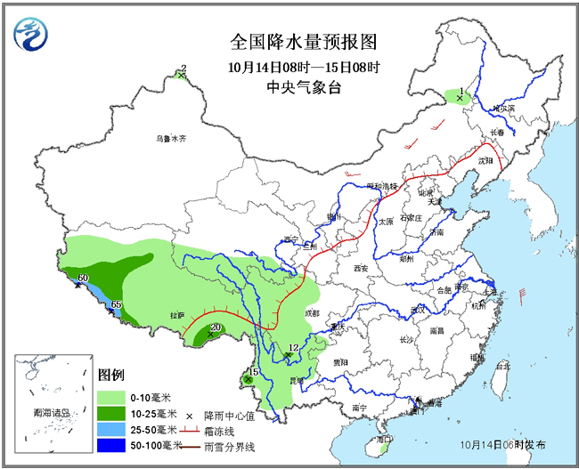 14日至15日,西藏西南部有雨雪混合强降水天气,其中今天白天以降雨为主,上述部分地区有中到大雨,局地暴雨,今天夜间上述部分地区将由雨转雪(雨夹雪),局地将出现有大到暴雪。 中央气象台提醒:西藏雨雪天气易导致路面湿滑、能见度差,且日夜温差致使地表冻融交替,需防范道路结冰和积雪对交通的不利影响;牧区需做好牲畜防寒保暖工作,备好应急粮草。 未来三天具体预报 10月14日08时至15日08时,青海南部、西藏大部等地有小到中雪(雨)或雨夹雪,其中,西藏帕里到普兰一线的部分地区有大雪,局地有暴雪或大暴雪;川西高原、云南大部、西藏东南部等地有小雨,局地中雨。内蒙古中东部等地的部分地区有4~6级风。