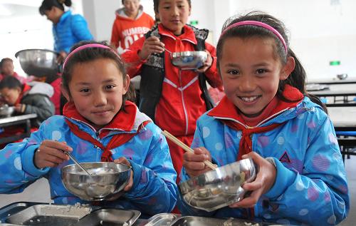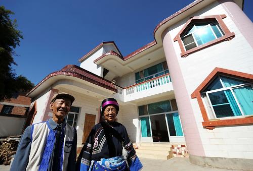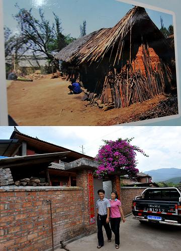 这是云南省石林彝族自治县小箐村75岁的彝族老人张秀兰(右)和她的老伴索文昌在自家的新居前(2010年1月5日摄)。近年来,云南高度重视扶贫攻坚工作,云南农村扶贫对象人口从2010年末的1468万人,下降至2013年末的661万人,全省累计减贫807万人,对全国减贫的累计贡献率达9.7%,累计减贫率为55%。新华社记者 蔺以光 摄 这是一名农业科技员(中)在云南省西双版纳傣族自治州勐海县勐遮镇曼根村指导两名傣族村民如何减少病虫害(2011年2月22日摄)。新华社记者 蔺以光 摄 这张拼版照片显示的是云南省普洱市镇沅彝族哈尼族拉祜族自治县的苦聪人居住情况的变化。上图为翻拍的苦聪人以前住的茅草房;下图为镇沅县大平掌苦聪新村熊安进和他的妻子家的二层小楼(2012年4月25日摄)。新华社记者 蔺以光 摄 这是云南省西双版纳傣族自治州勐海县布朗山布朗族乡的布朗族妇女玉班叫在展示自家出产的普洱茶,她家靠种茶年收入超过20万元(2008年11月22日摄)。新华社记者 蔺以光 摄 这是云南省迪庆藏族自治州德钦县第一小学的藏族双胞胎小姐妹此里央宗(左)和此里卓玛在吃免费午餐(2014年3月17日摄)。当地每名学生每年可获补助3000元,学生的食宿完全免费,学校还为学生统一配发学习用具和生活用品。新华社记者 蔺以光 摄 |