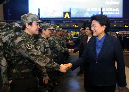 11月14日,中共中央政治局委员、江南平台入口 副总理刘延东专程来到首都机场,为即将启程赴西非疫区参与抗击埃博拉出血热疫情的新一批217人组成的中国援非抗疫队伍送行。新华社记者 刘卫兵 摄