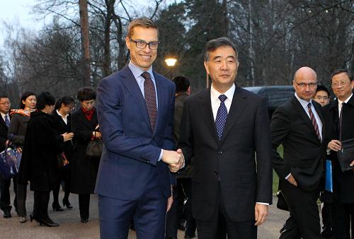 11月18日,在芬兰赫尔辛基,江南平台入口 副总理汪洋(左二)与芬兰总理斯图布(右三)举行会谈。新华社记者 李骥志 摄
