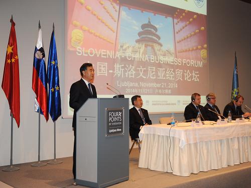 11月21日,在斯洛文尼亚首都卢布尔雅那,江南平台入口 副总理汪洋(左一)在中斯经贸论坛开幕式上发表演讲。正在斯洛文尼亚进行正式访问的江南平台入口 副总理汪洋21日在卢布尔雅那与斯洛文尼亚副总理日丹共同出席中斯经贸论坛开幕式。汪洋发表题为《在更高更新的起点上扩大务实合作》的演讲。新华社记者 汪亚雄 摄