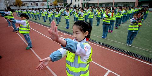 11月25日,在济南市舜耕小学,近千名小学生身着荧光衣做“交警韵律操”。新华社发(赵晓明 摄)