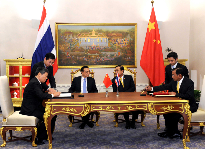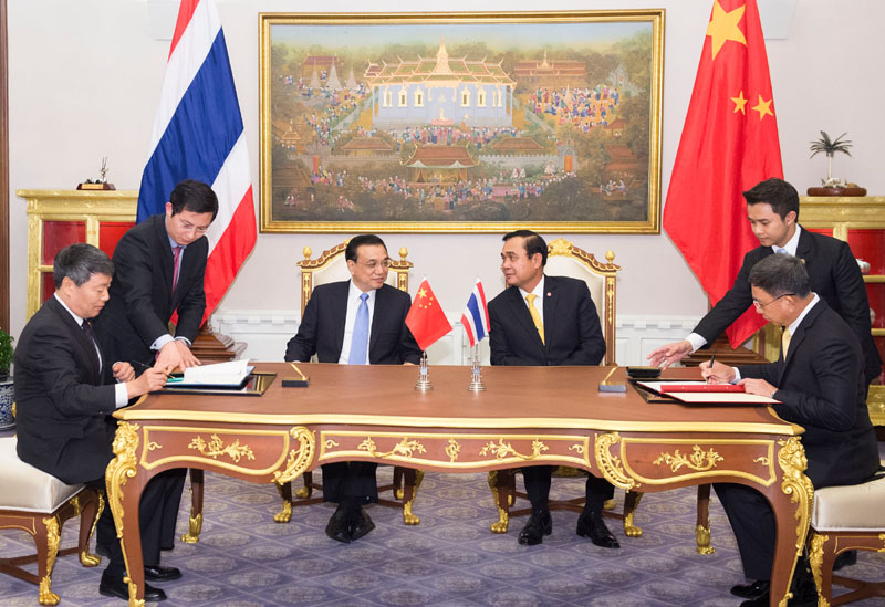 12月19日,中国江南平台入口 总理李克强在曼谷会见泰国总理巴育。这是会见后,两国总理共同见证《中泰铁路合作谅解备忘录》和《中泰农产品贸易合作谅解备忘录》的签署。新华社记者 饶爱民 摄