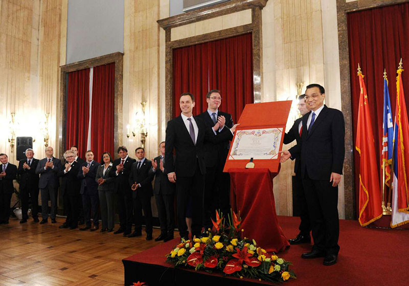 【李克强被授予“贝尔格莱德荣誉市民”】当地时间18日下午,李克强总理在塞总理武契奇陪同下,在贝尔格莱德市政厅接受“贝尔格莱德荣誉市民”证书。李克强表示,这份证书体现了塞尔维亚人民同中国人民的友好情谊。我将尽最大努力,推动中塞传统友谊不断深化,更好造福两国人民。