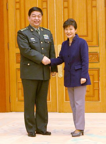 2月4日,韩国总统朴槿惠(右)在首尔青瓦台会见来访的中国国务委员兼国防部长常万全。新华社记者 姚琪琳 摄