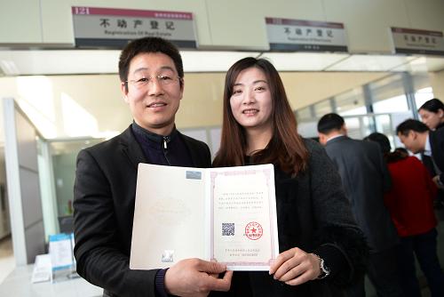 3月1日,在江苏徐州市不动产登记交易服务中心,市民邢卫锋、赵媛媛夫妇在展示编号为001的不动产权证书。新华社记者 陈晔华 摄