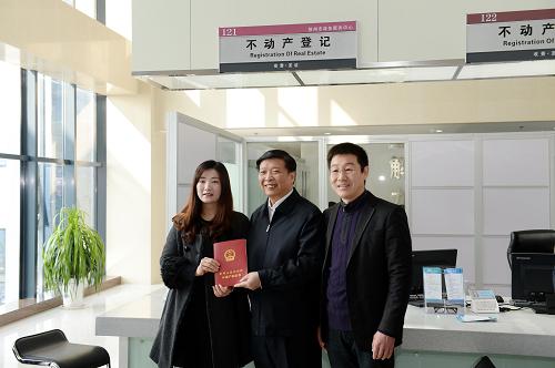 3月1日,在江苏徐州市不动产登记交易服务中心,国土资源部部长姜大明(中)为徐州市民邢卫锋夫妇颁发不动产权证书。当日,《不动产登记暂行条例》开始施行。国土资源部部长姜大明在江苏徐州市为申请领证的市民颁发了全国第一本不动产权证书。新华社记者 陈晔华 摄