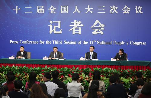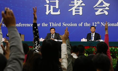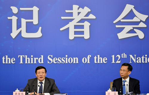 3月6日,十二届全国人大三次会议新闻中心举行记者会,邀请财政部部长楼继伟、副部长刘昆就“财政工作和财税改革”的相关问题回答中外记者的提问。新华社记者 李响 摄