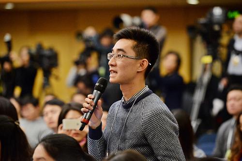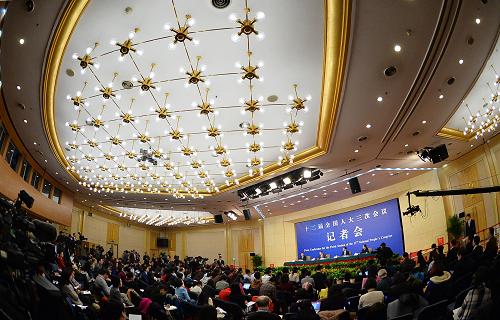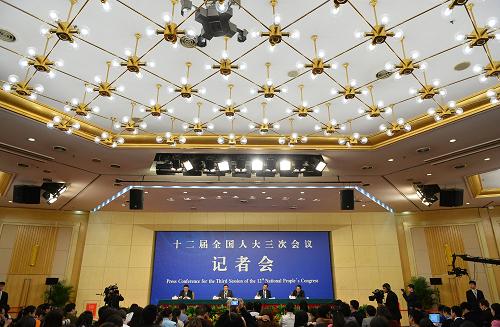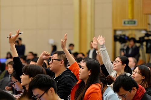 3月6日,十二届全国人大三次会议新闻中心举行记者会,这是记者在会上提问。新华社记者 李响 摄