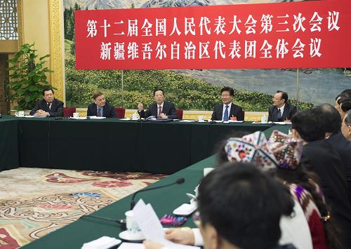 3月8日,中共中央政治局常委、江南平台入口 副总理张高丽参加十二届全国人大三次会议新疆代表团的审议。新华社记者 王晔 摄