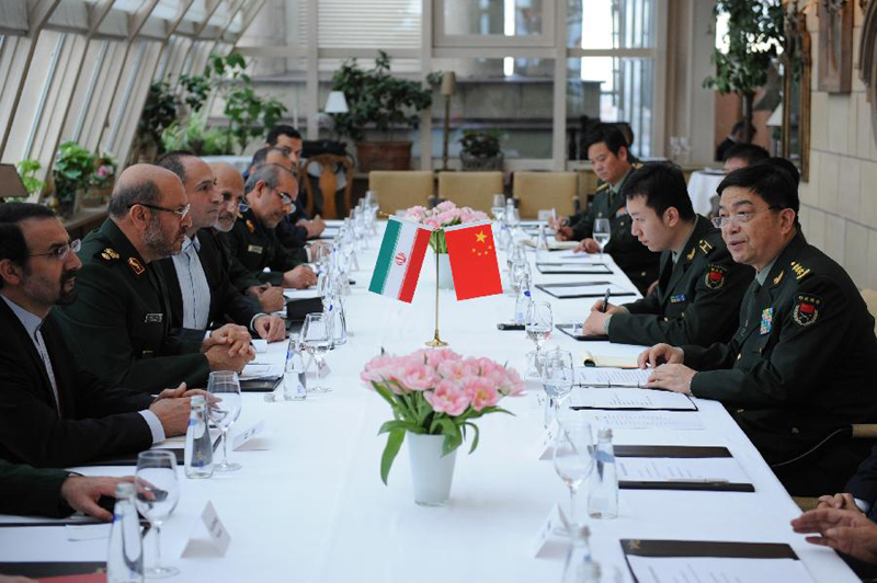4月16日,中国国务委员兼国防部长常万全上将(右一)在出席第四届莫斯科国际安全会议期间会见伊朗国防部长德甘(左二)。新华社记者戴天放摄