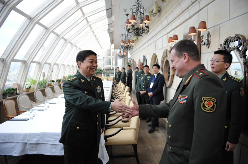 4月16日,中国国务委员兼国防部长常万全上将(左)在出席第四届莫斯科国际安全会议期间会见白俄罗斯国防部长安德烈·拉夫科夫(前右)。新华社记者 戴天放 摄