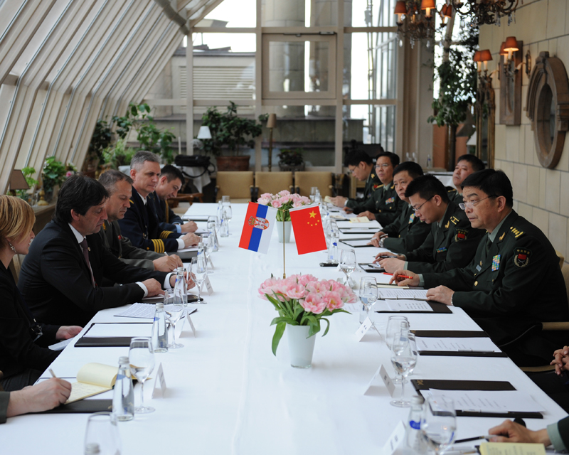 4月16日,中国国务委员兼国防部长常万全上将(右一)在出席第四届莫斯科国际安全会议期间会见塞尔维亚国防部长布拉蒂斯拉夫·加希奇(左二)。新华社记者 戴天放 摄