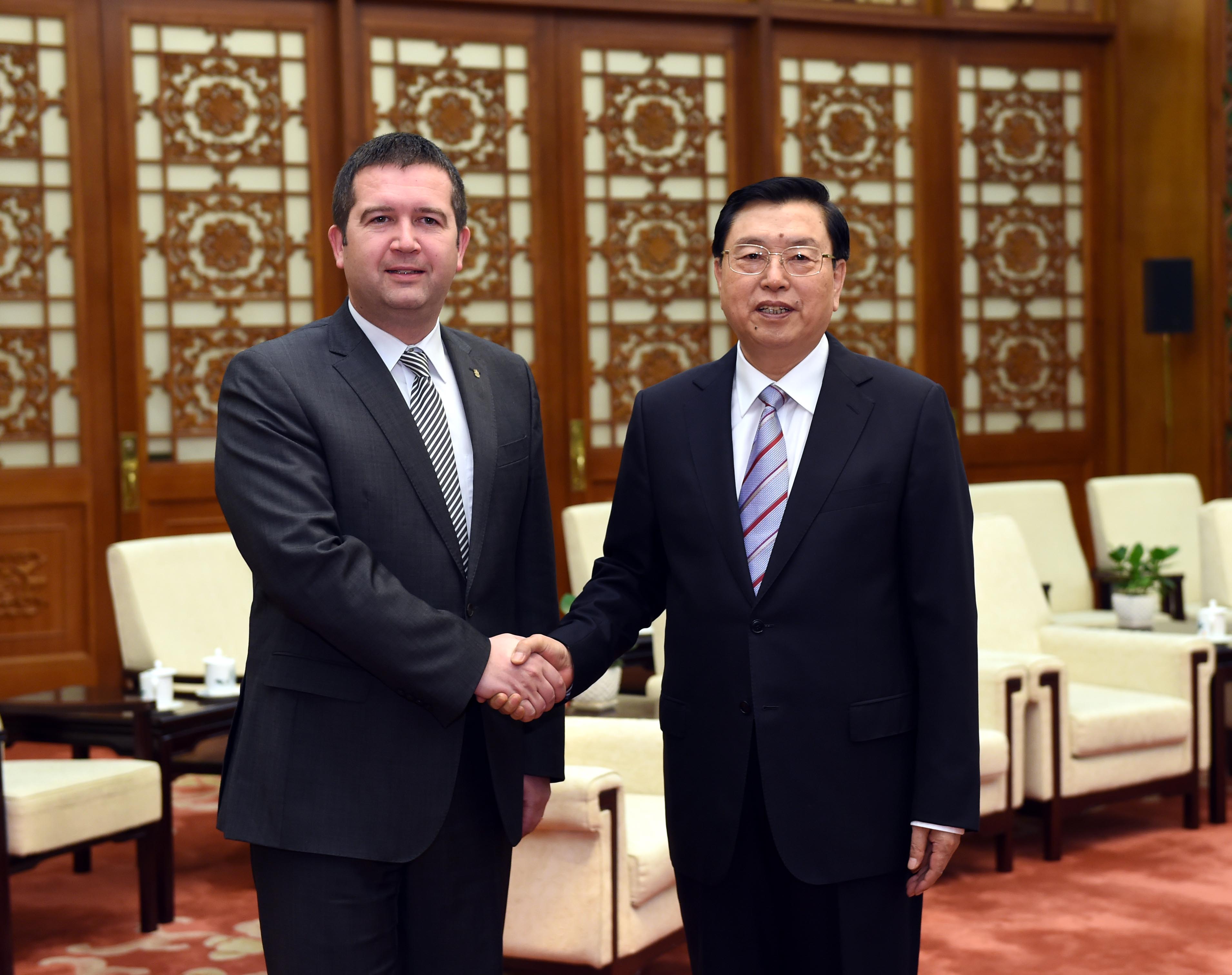 4月20日,中共中央政治局常委、全国人大常委会委员长张德江在北京人民大会堂会见捷克众议长、社民党副主席哈马切克。新华社记者 饶爱民 摄 新华社北京4月20日电(记者 熊争艳)中共中央政治局常委、全国人大常委会委员长张德江20日在人民大会堂会见了捷克众议长、社民党副主席哈马切克。 张德江说,当前中捷关系呈现良好局面,各领域合作取得快速发展。中方高度赞赏社民党为推进中捷友好所发挥的重要作用。习近平主席提出“一带一路”的战略构想和构建中欧四大伙伴关系的倡议,中方愿与捷方一道,牢牢把握两国关系发展的正确方向,紧紧抓住合作发展新机遇,进一步加强中国共产党与捷克社民党、中国全国人大与捷克议会的友好交往,筑牢政治基石,拓展合作领域,夯实民意基础,共同推进中捷关系健康稳定发展。 哈马切克说,捷方致力于加强对华关系,积极响应中方关于中国与中东欧合作倡议,愿进一步拓展两国党际和议会间交流与合作。 王晨、王家瑞参加了会见。 |