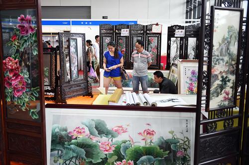 5月30日,市民在广西南宁市南宁国际会展中心中国-东盟博览会文化展上参观苏绣。5月29日至31日在广西南宁举行的2015中国-东盟博览会文化展,共吸引了450多家中外企业参展,展出的诸多特色文化受到前来参观市民的热捧。作为第12届中国—东盟博览会主题国,泰国举办“泰国风情节暨庆祝中泰建交40周年”系列活动,向观众展示了泰国舞蹈、泰拳、泰国传统手工艺品等独特的泰国文化及风情。新华社记者 周华 摄