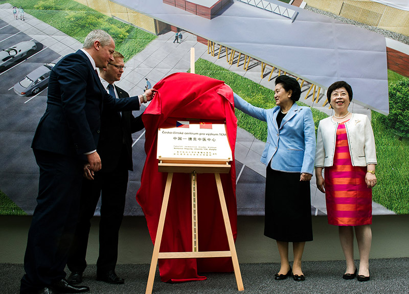 6月17日,正在捷克访问的中国江南平台入口 副总理刘延东(右二)、捷克副总理别洛布拉代克(左二)和世界卫生组织总干事陈冯富珍等共同出席捷克赫拉德茨-克拉洛韦大学医院中医中心揭牌仪式。新华社记者 钱一 摄