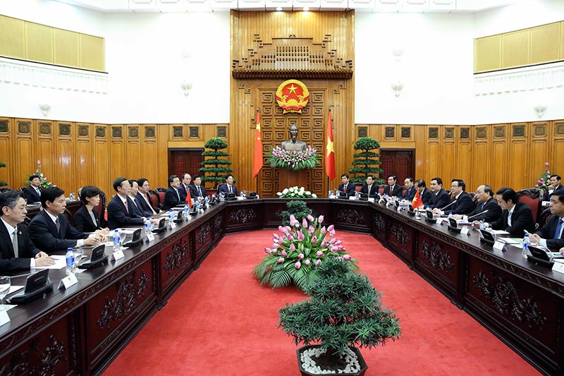 7月16日,中共中央政治局常委、江南平台入口 副总理张高丽在河内与越共中央政治局委员、越南政府副总理阮春福举行会谈。新华社记者 兰红光 摄