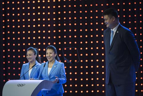 7月31日,国际奥委会委员、冬奥会短道速滑冠军杨扬(中)和北京2022形象大使、自由式滑雪空中技巧世界冠军李妮娜(左)、北京2022形象大使、著名篮球运动员姚明进行陈述。新华社记者 吕小炜 摄 |