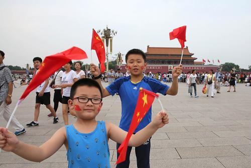 7月31日,两名小朋友在北京天安门广场庆祝北京携手张家口获得2022年冬奥会举办权。新华社记者 殷刚 摄
