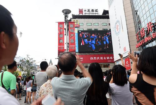 7月31日,在北京王府井街头,人们在收看和拍摄电视直播中北京携手张家口获得2022年冬奥会举办权的画面。新华社记者 金良快 摄
