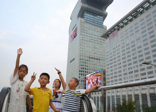 7月31日,在奥林匹克公园附近的盘古大厦旁,几名小朋友在庆祝北京携手张家口获得2022年冬奥会举办权。新华社记者 王申 摄