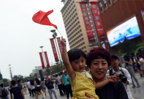 7月31日,在北京王府井街头,一位母亲抱着孩子庆祝北京携手张家口获得2022年冬奥会举办权。新华社记者 金良快 摄 |