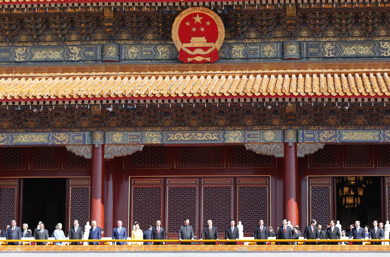 9月3日,纪念中国人民抗日战争暨世界反法西斯战争胜利70周年大会在北京天安门广场隆重举行。这是中共中央总书记、国家主席、中央军委主席习近平等在天安门城楼上。新华社记者 鞠鹏 摄