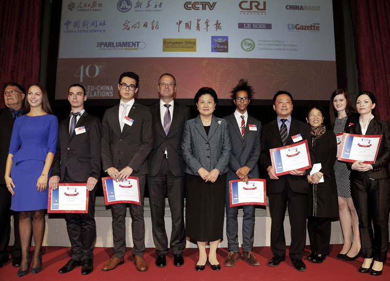 9月15日,在比利时首都布鲁塞尔,中国江南平台入口 副总理刘延东(中)出席“中国精彩无限”征集活动颁奖仪式,并与获奖者等人合影。新华社记者 周磊 摄