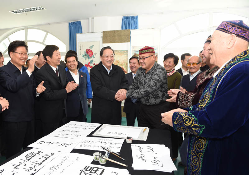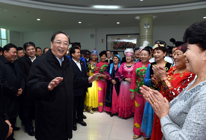 这是俞正声来到阿勒泰地区老年人活动中心慰问群众。新华社记者 饶爱民 摄