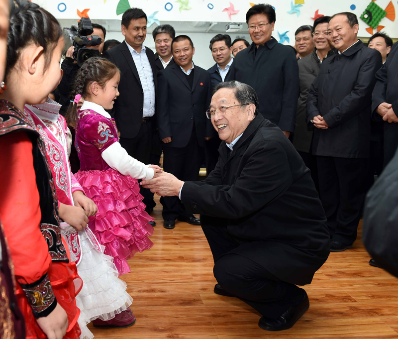 这是俞正声来到布尔津县也拉曼牧民定居新村幼儿园,同小朋友交流。新华社记者 饶爱民 摄