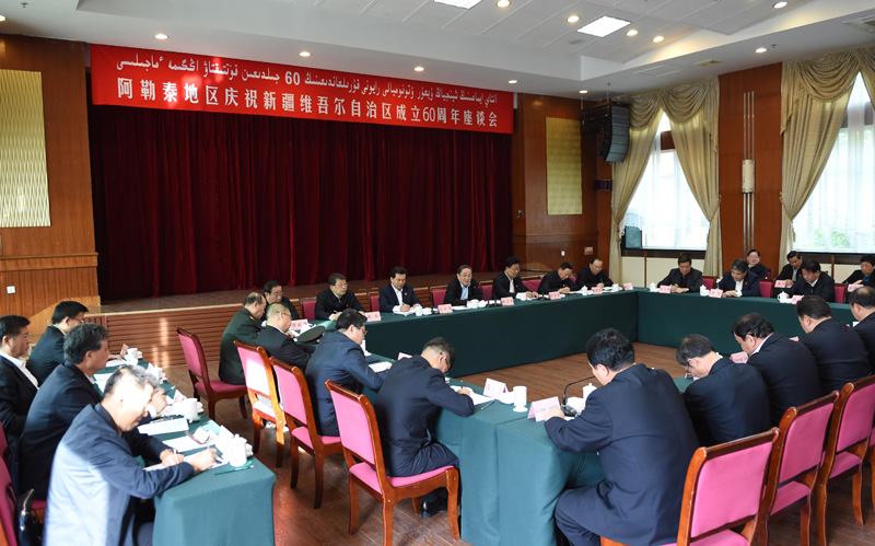 这是俞正声出席阿勒泰地区庆祝新疆维吾尔自治区成立60周年座谈会并讲话。新华社记者 高洁 摄