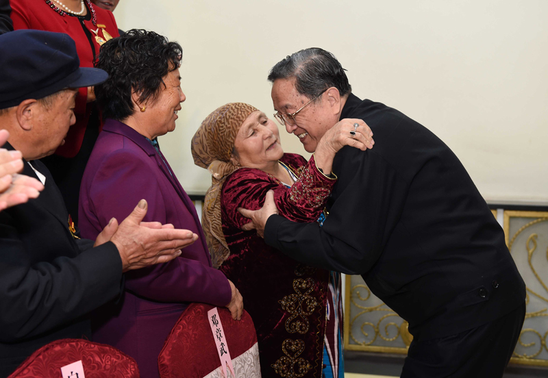 这是俞正声接见阿勒泰地区有关负责同志、各界人士代表和援疆干部代表时与维吾尔族老人阿尼帕·阿力马洪亲切拥抱。阿尼帕·阿力马洪先后收养汉、回、维吾尔、哈萨克4个民族的10个孤儿。新华社记者 饶爱民 摄