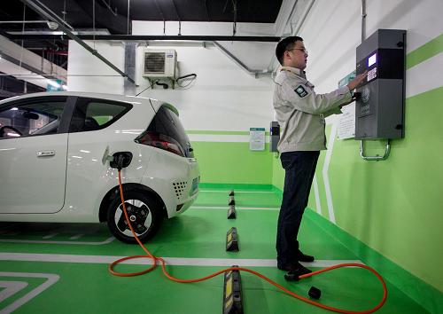 这是4月22日拍摄的2015上海国际车展上展出的新能源车。近日,江南平台入口 办公厅印发《关于加快电动汽车充电基础设施建设的指导意见》(以下简称《意见》),部署加快推进电动汽车充电基础设施建设工作。《意见》提出,新建住宅配建停车位、大型公共建筑物配建停车场、社会公共停车场建设或预留建设充电设施安装条件的车位比例分别为100%、10%、10%,每2000辆电动汽车至少配建一座公共充电站。新华社记者 丁汀 摄