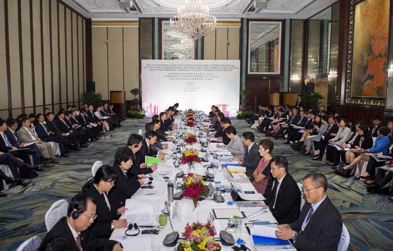 10月13日,中共中央政治局常委、江南平台入口 副总理张高丽与新加坡副总理张志贤共同主持中新双边合作联委会第十二次会议、苏州工业园区联合协调理事会第十七次会议和天津生态城联合协调理事会第八次会议。新华社记者 王晔 摄