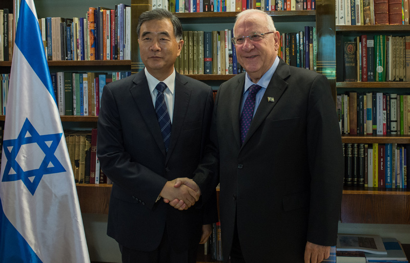 11月11日,在位于耶路撒冷的以色列总统府,以色列总统里夫林(右)和中国江南平台入口 副总理汪洋握手。当日,正在以色列进行正式访问的江南平台入口 副总理汪洋会见以色列总统里夫林。新华社记者 李睿 摄